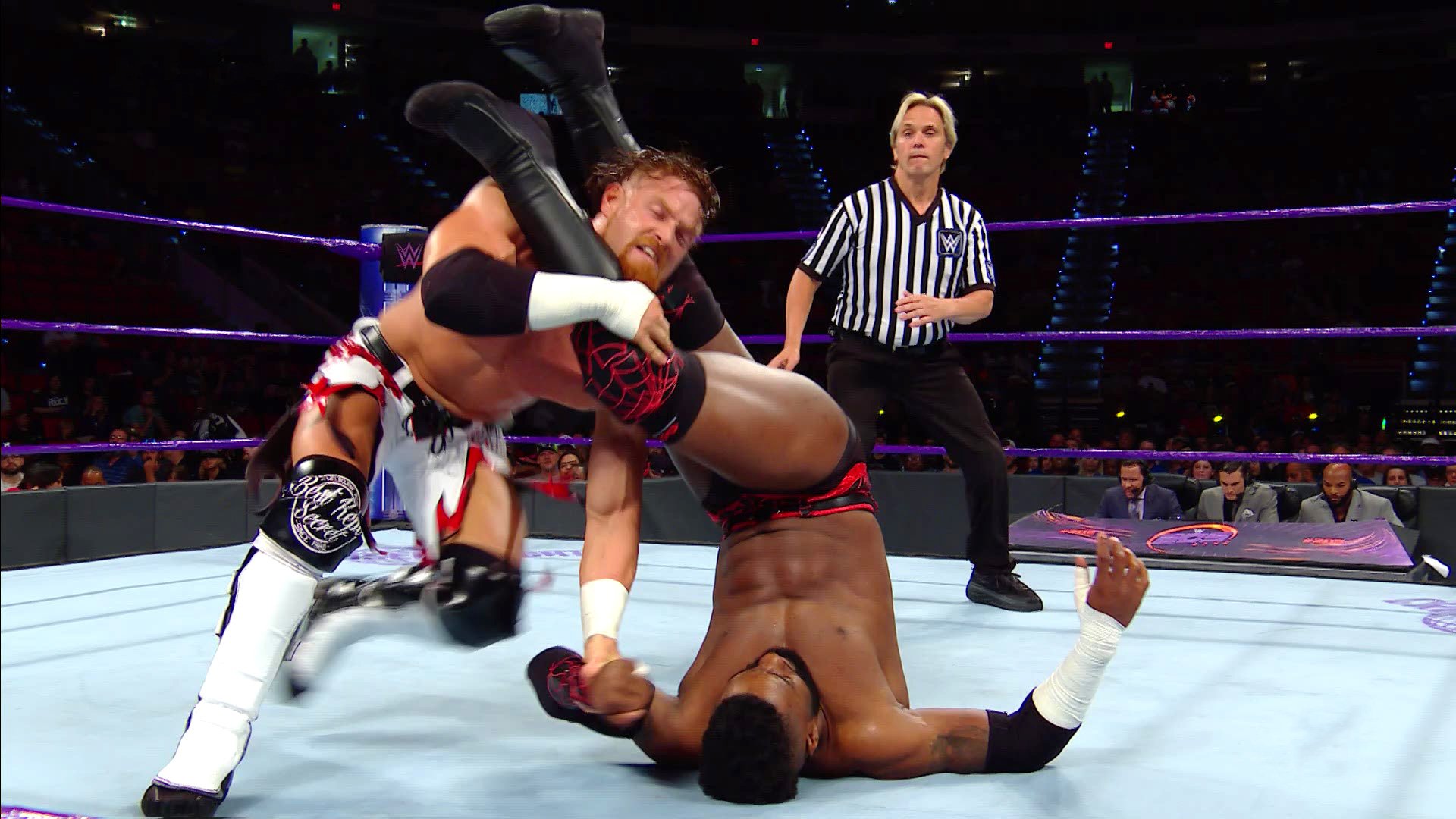 We see a big strike exchange that ends in Murphy catching Cedric’s foot and hitting a big running bicycle knee, for a near fall. Cedric counters a Murphy’s Law into a small package, catches Cedric’s foot for a big Power Bomb near fall and Murphy hits a Kamigoye Knee strike, but to no avail.